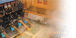 江戸時代から伝わる草津独特の集団入浴法が時間湯。長い板を使った「湯もみ」を20分間続け、約60度の源泉を水を使わずに47〜48度までさまします。この時全員で歌うのが「♪草津よいと〜こ、いちど〜は〜おいで〜ドッコイッショ♪」の草津節です